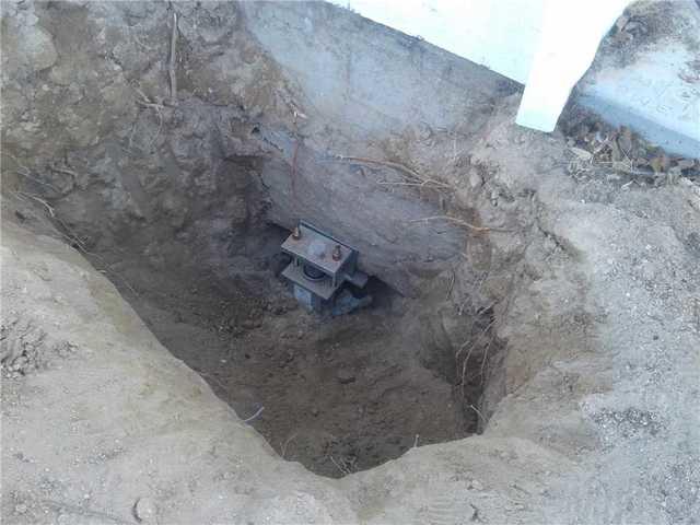 This picture shows an installed Push Pier. Our crew installed these to the base of a home foundation to raise, level, and strengthen it.