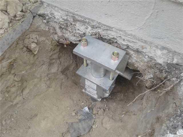 The picture is a installed helical pier lifting a home's foundation. This strengthens a home foundation.