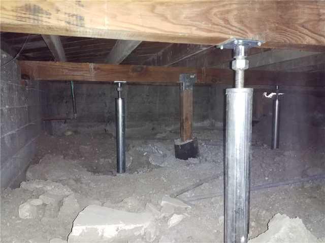 Our Crew Poured new concrete bases, and attached new all Metal Smart Jacks to the Floor Joists. This raised the floor back to it's proper height. The floor was now stabilized. The attached picture shows the new Smart Jacks installed in the home's Crawlspace.