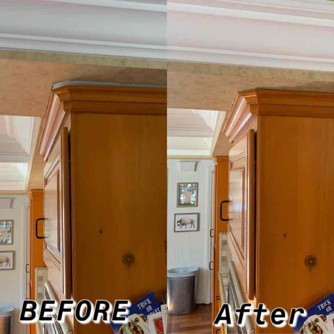 This is a before and after photo of a gap that was caused by sagging floors, and that gap is closed by Saber installing Smart Jacks to support the sagging floors.