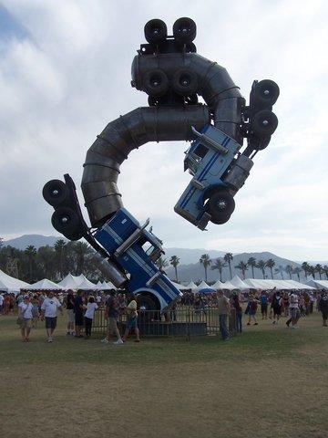 The sculpture was installed by Saber Foundation at the Coachella music festival. We used helical anchors (normally used to repair damaged foundations) to support the weight of the trucks. This just shows how strong the helical anchors are!
