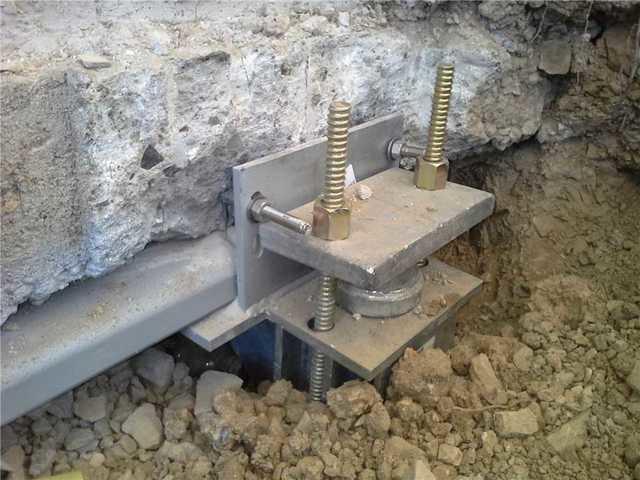 The foundation had a void space under it. This picture shows the use of a Helical Pier to level the foundation slab.